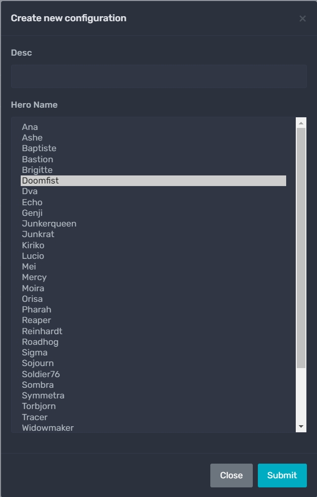 스완 패널 메인 화면에서구성(Configuration)탭으로 이동합니다.(Create)버튼을 클릭 후 원하는 영웅을 선택 또는 마우스 왼쪽 버튼을 클릭하고 이동하거나(CTRL)키를 눌러 원하는 영웅을 동시 선택합니다. 전체선택 버튼(CTRL+A)(Desc) 칸에 꿀값을 설명할 문장을 입력하고 꿀값을 생성합니다.